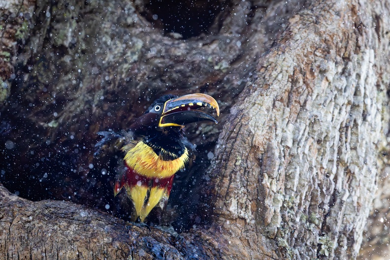 Chestnut-eared aracari taking a bath